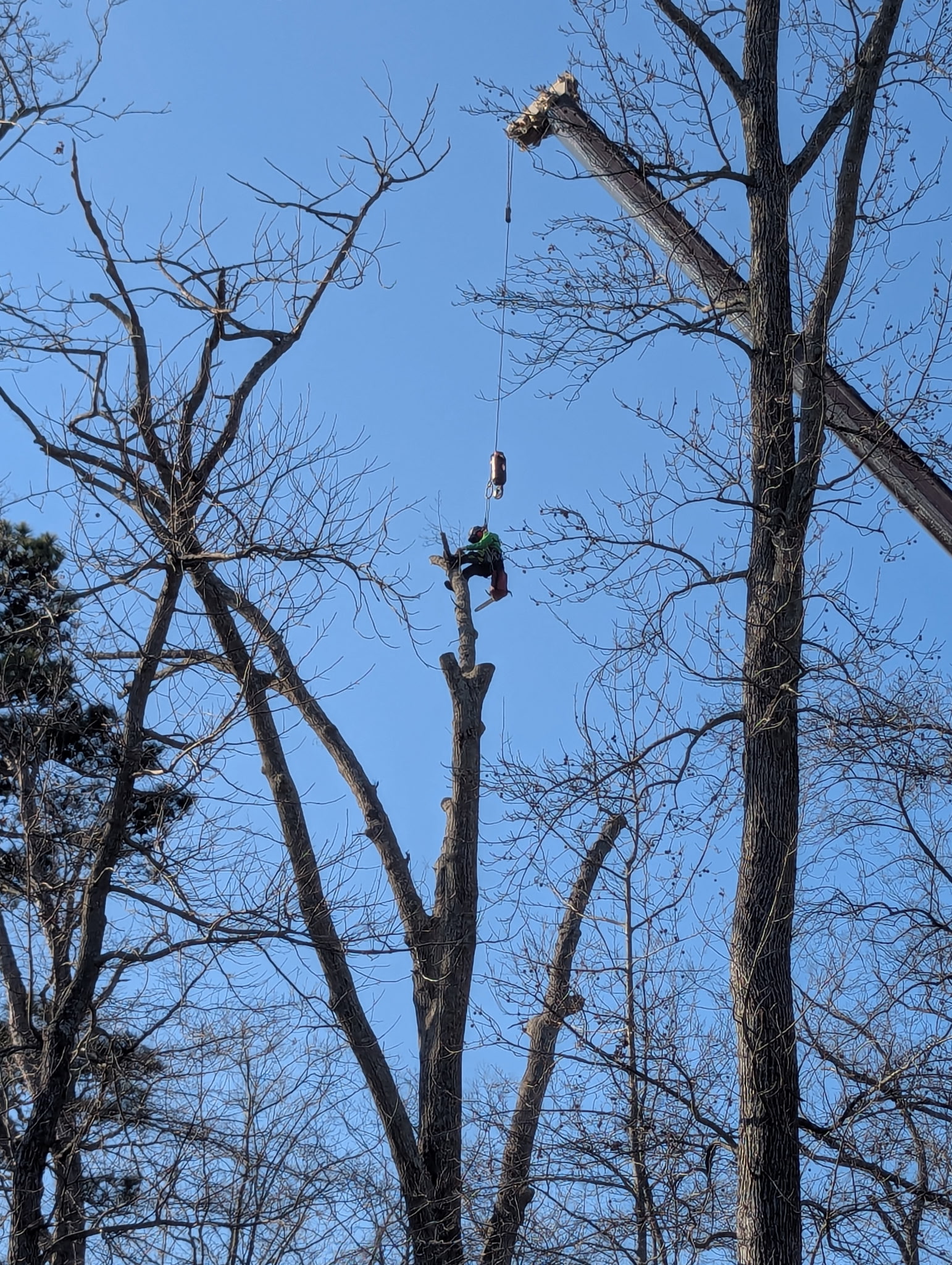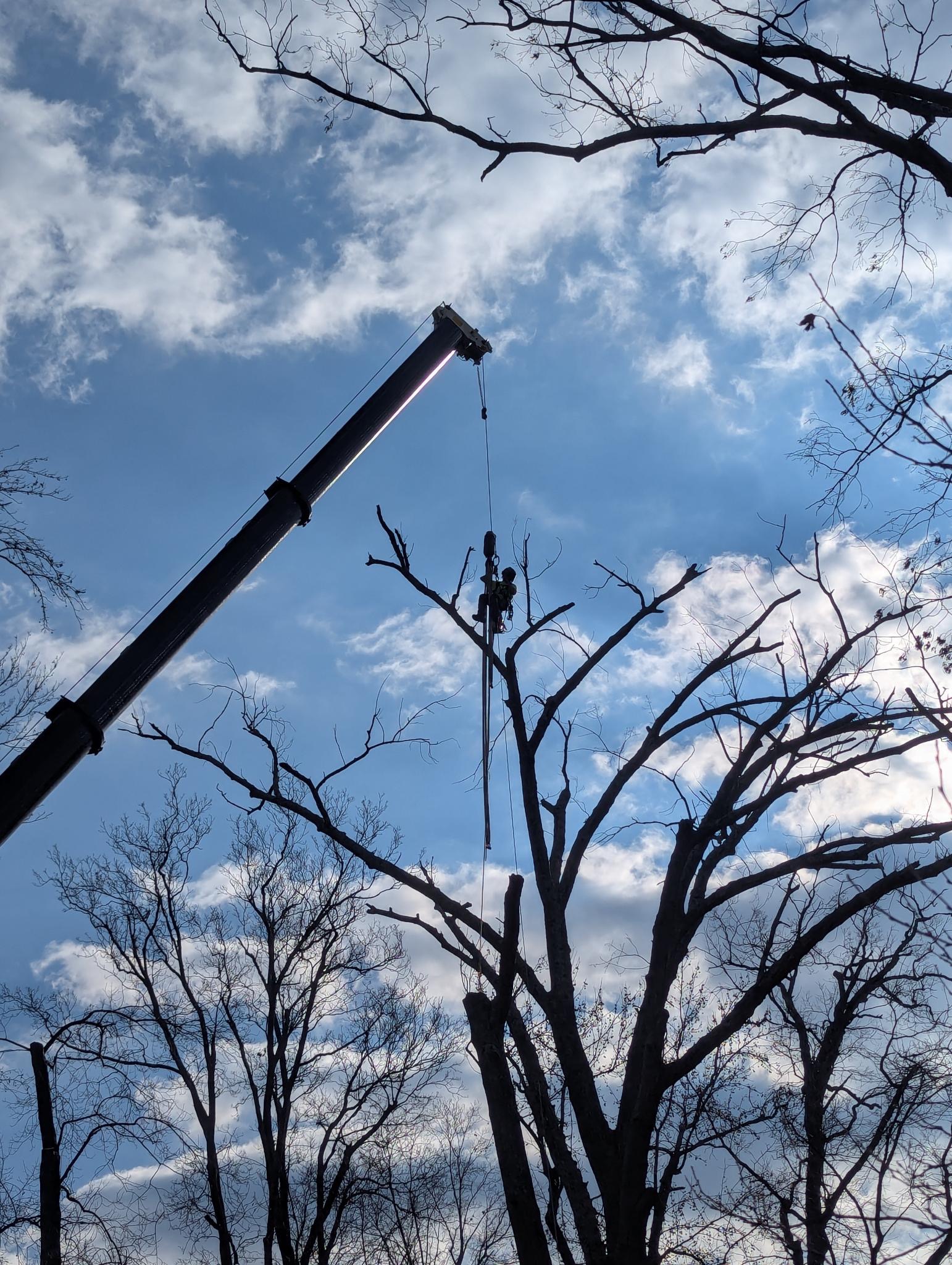 Several of the trees were too large to remove with standard rigging, so we brought in a crane for those particular removals. The crane allowed us to take down large trunks and limbs in controlled sections, lowering heavy pieces directly onto protected areas. Using a crane reduced the need for cutting larger swaths through the property and sped up the work in tight spaces near the house or buildings.