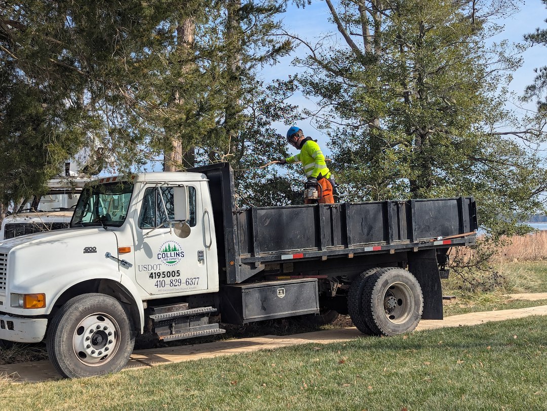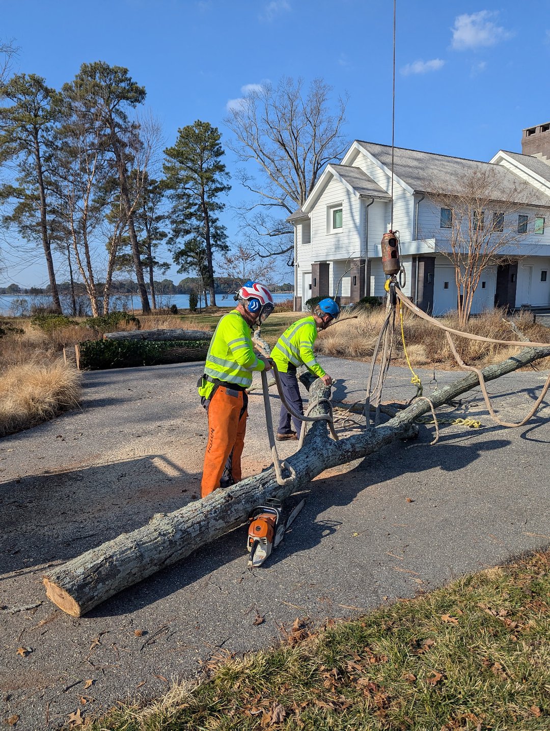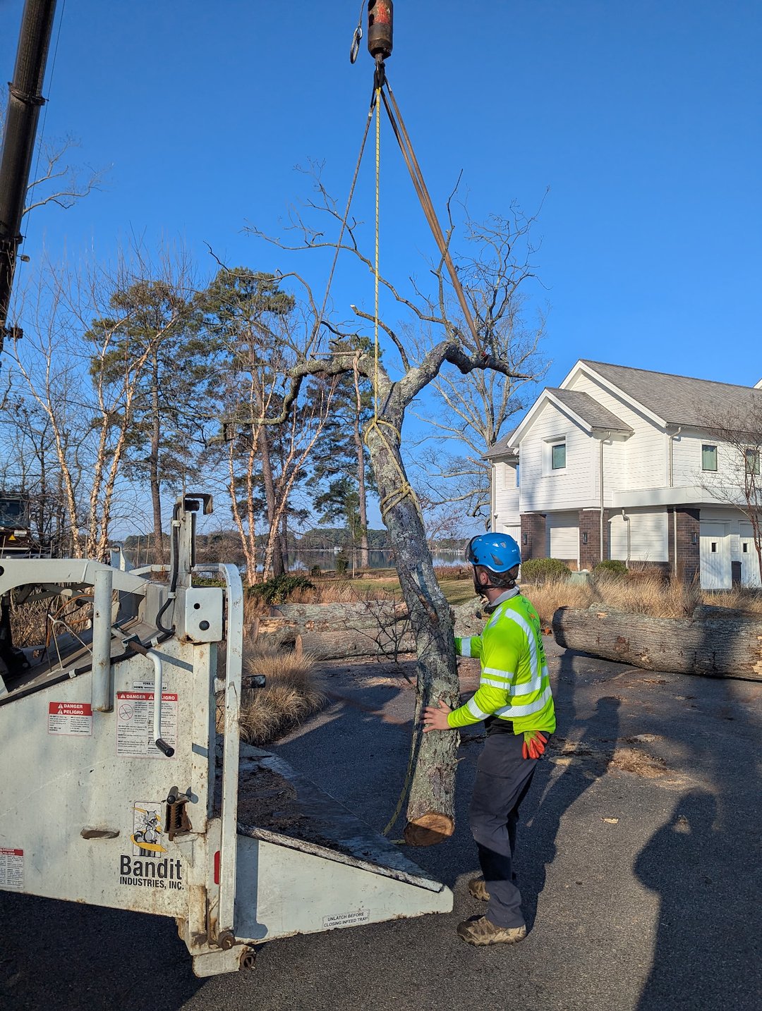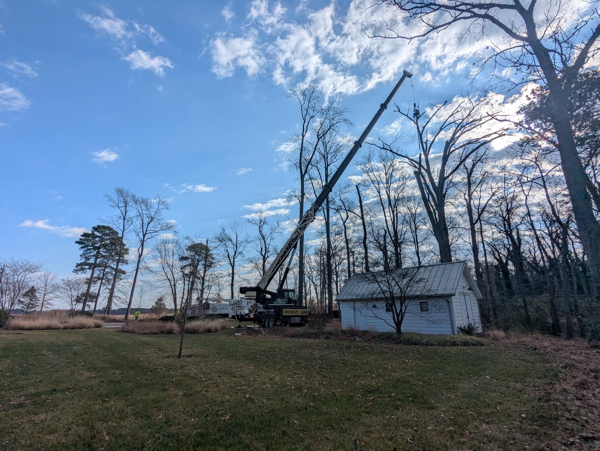 Collins Tree Experts completed the tree removal project in Oxford, MD with attention to safety and to preserving the homeowner's landscape. By matting the site, working in winter conditions, and using a crane where needed, we removed hazardous trees while keeping damage to a minimum. The reuse of the large oak wood was an added benefit for the property owner and the local craftsman.