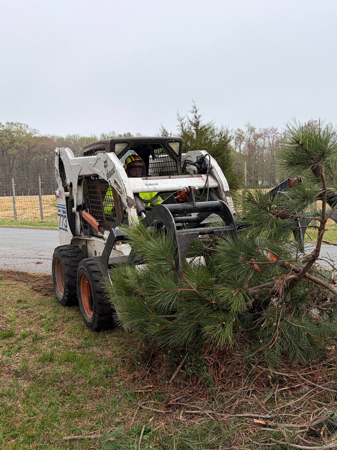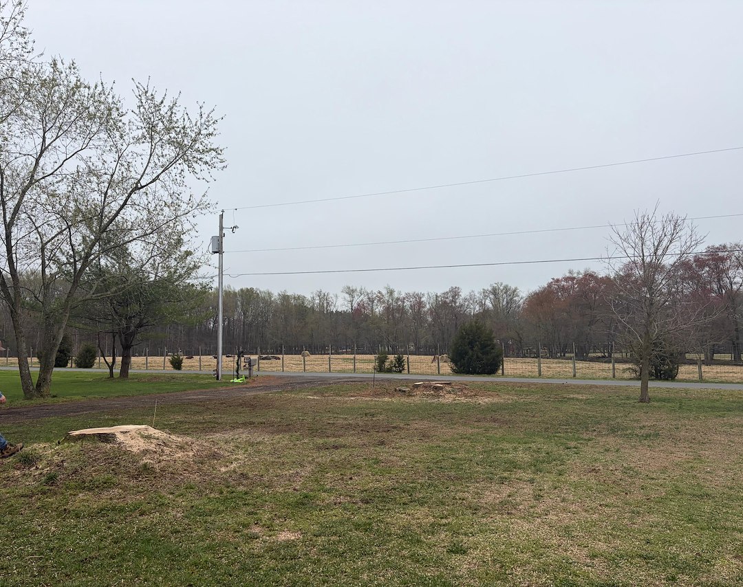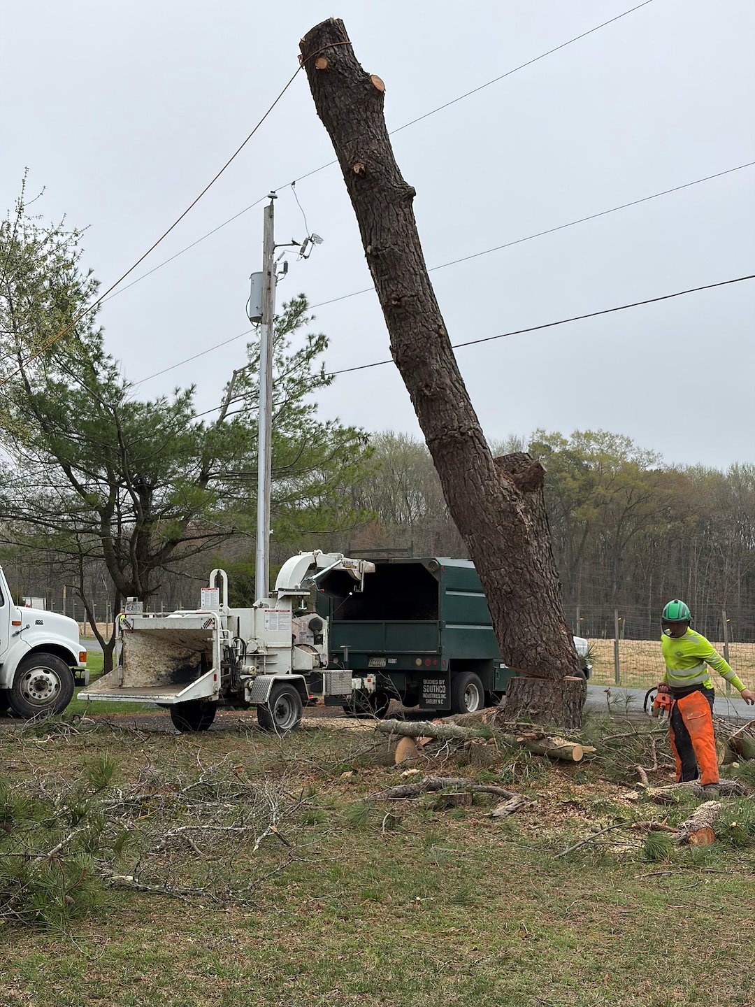 Recently in Denton, MD our team completed a tree removal where one of the trees, a Loblolly Pine, was growing into the power lines. The tree had grown close enough to the main distribution lines that it needed to be taken down to eliminate the hazard. We coordinated the work with the local utility to make sure the removal could be done safely and in compliance with Maryland regulations.