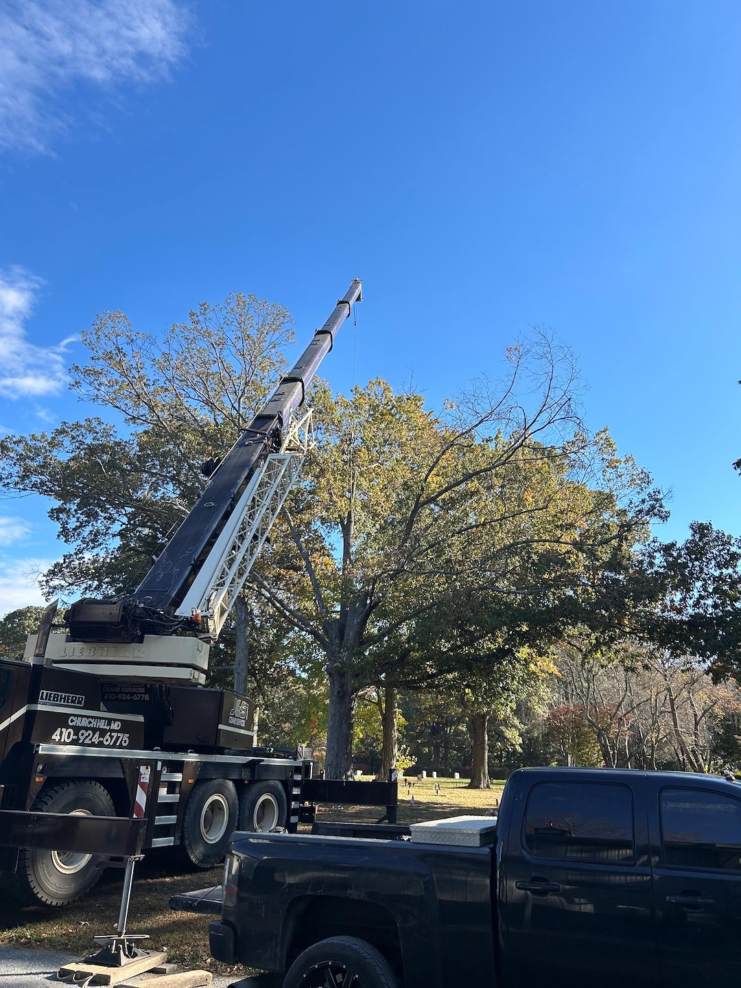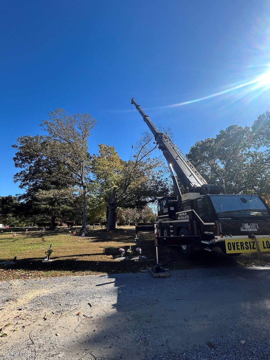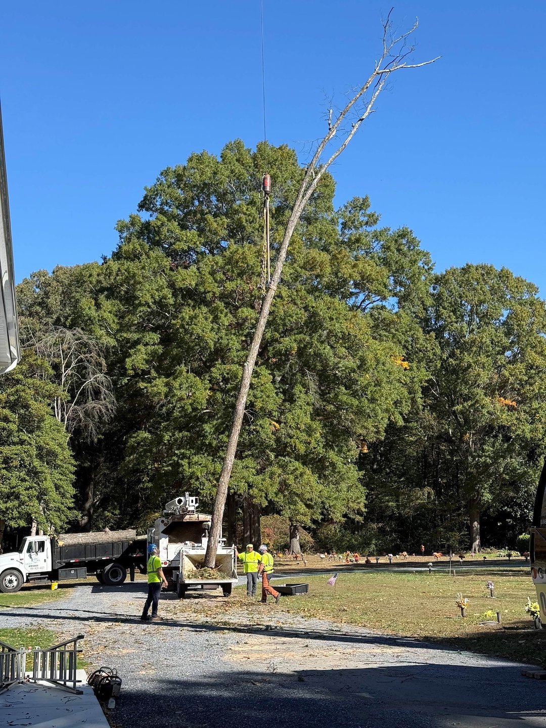 Recently, we had the privilege of collaborating with J&S Crane on a tree removal project at Woodlawn Cemetery in Easton, MD, where we removed a large, dying White Oak tree. Given its size and proximity to cemetery plots, we employed a crane to carefully dismantle it piece by piece. The entire operation took a full day due to the meticulous process required to remove each limb and section of the trunk, ensuring no damage occurred to the nearby gravesites. We extend our sincere gratitude to Jason and Jake at J&S Crane for their diligent work.