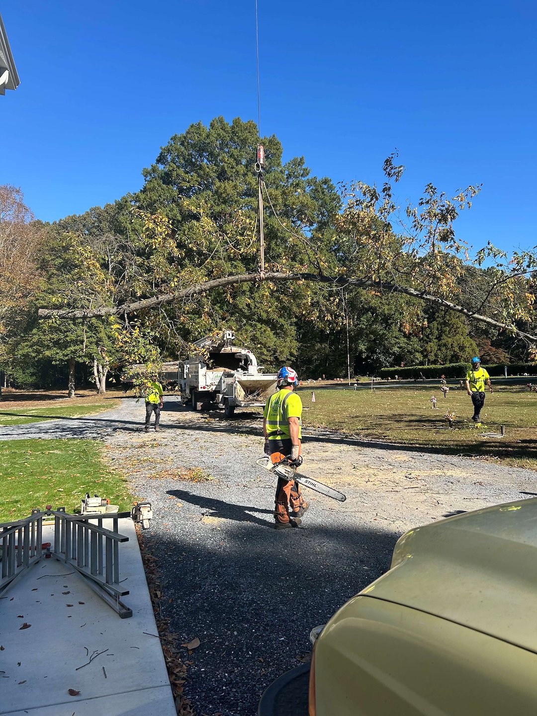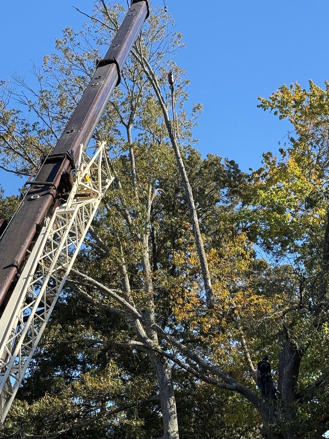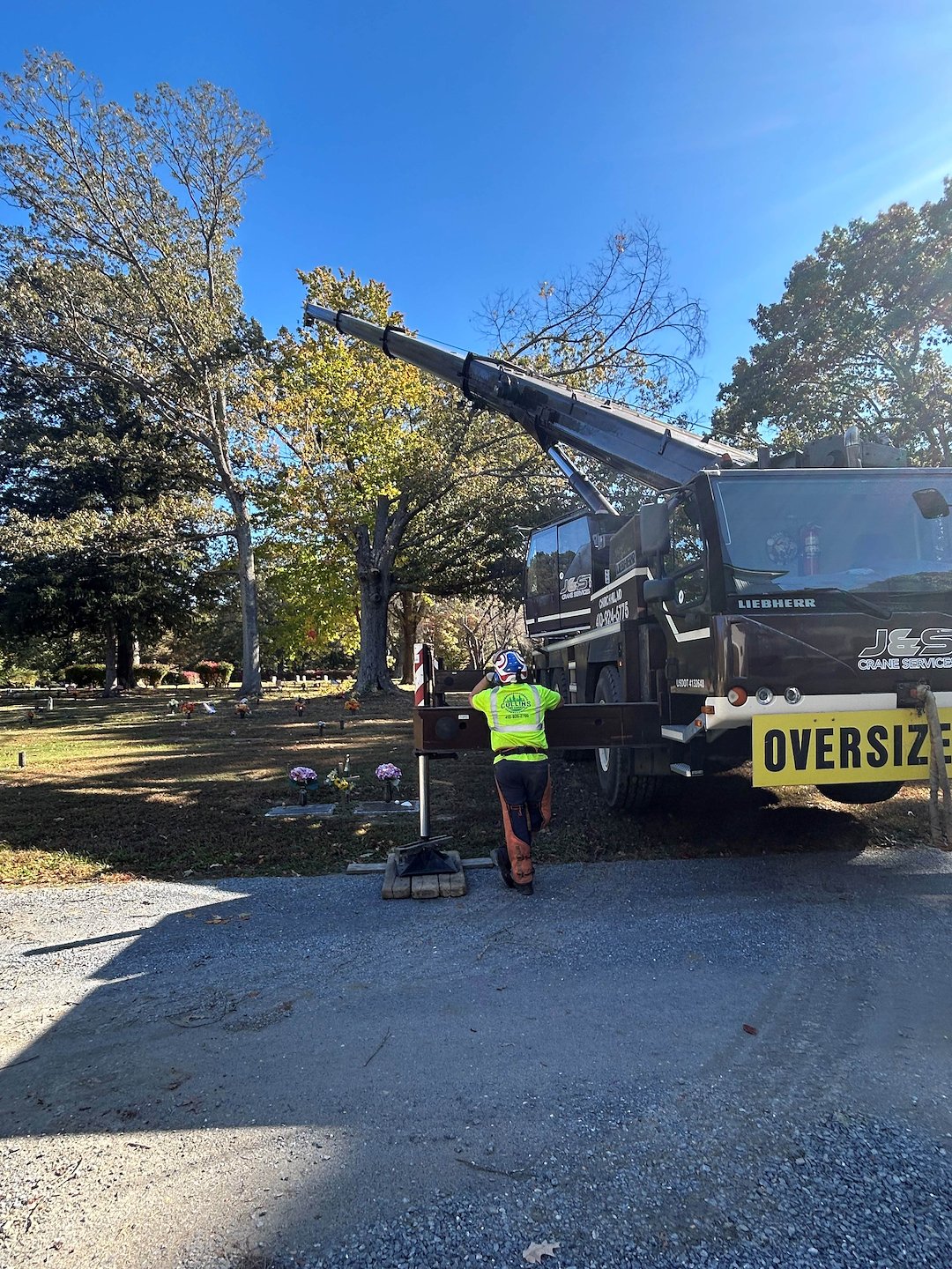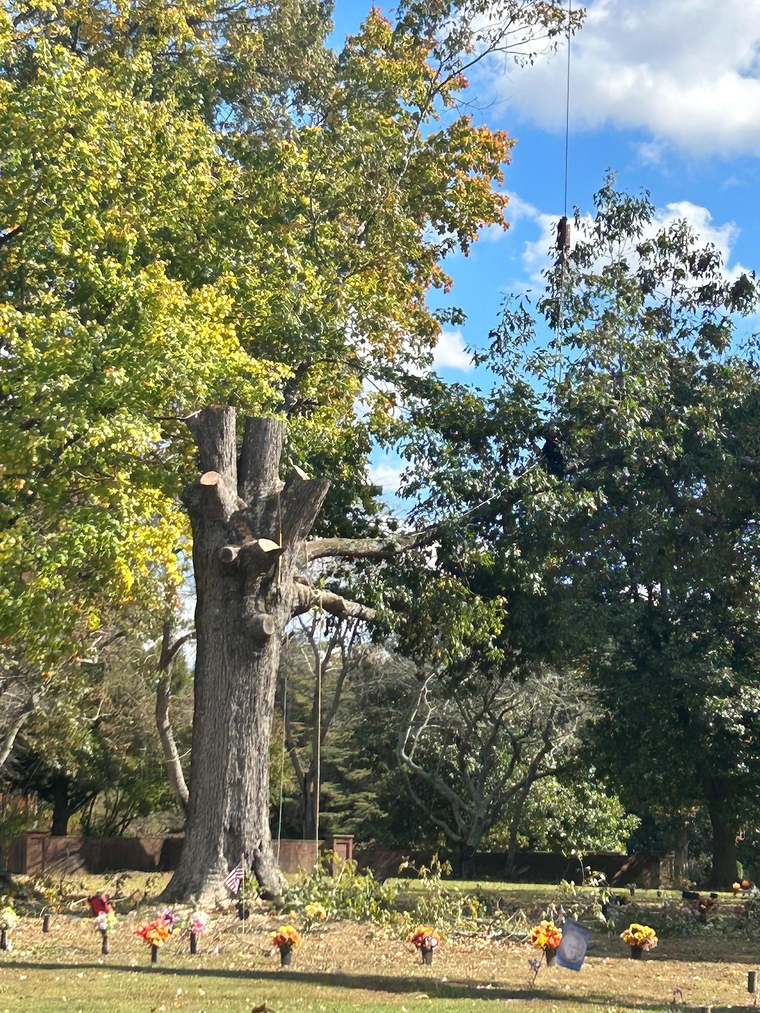 Recently, we had the privilege of collaborating with J&S Crane on a tree removal project at Woodlawn Cemetery in Easton, MD, where we removed a large, dying White Oak tree. Given its size and proximity to cemetery plots, we employed a crane to carefully dismantle it piece by piece. The entire operation took a full day due to the meticulous process required to remove each limb and section of the trunk, ensuring no damage occurred to the nearby gravesites. We extend our sincere gratitude to Jason and Jake at J&S Crane for their diligent work.